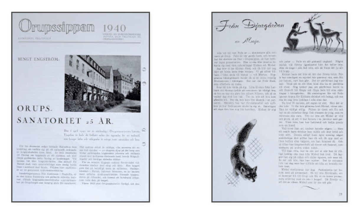 1927 startades patientföreningen "Nytta och trevnad" som gav ut tidningen "Orupssippan". Denna utkom en gång per år den 1 maj (år 1928-1970). Patientföreningen startade också en djurgård redan 1915 som under årens lopp varit till mycken glädje. Djurgården är inspirationskällan till namnen Djurgårdsvägen som löper mellan Sanatorievägen och Lars Ols väg.
