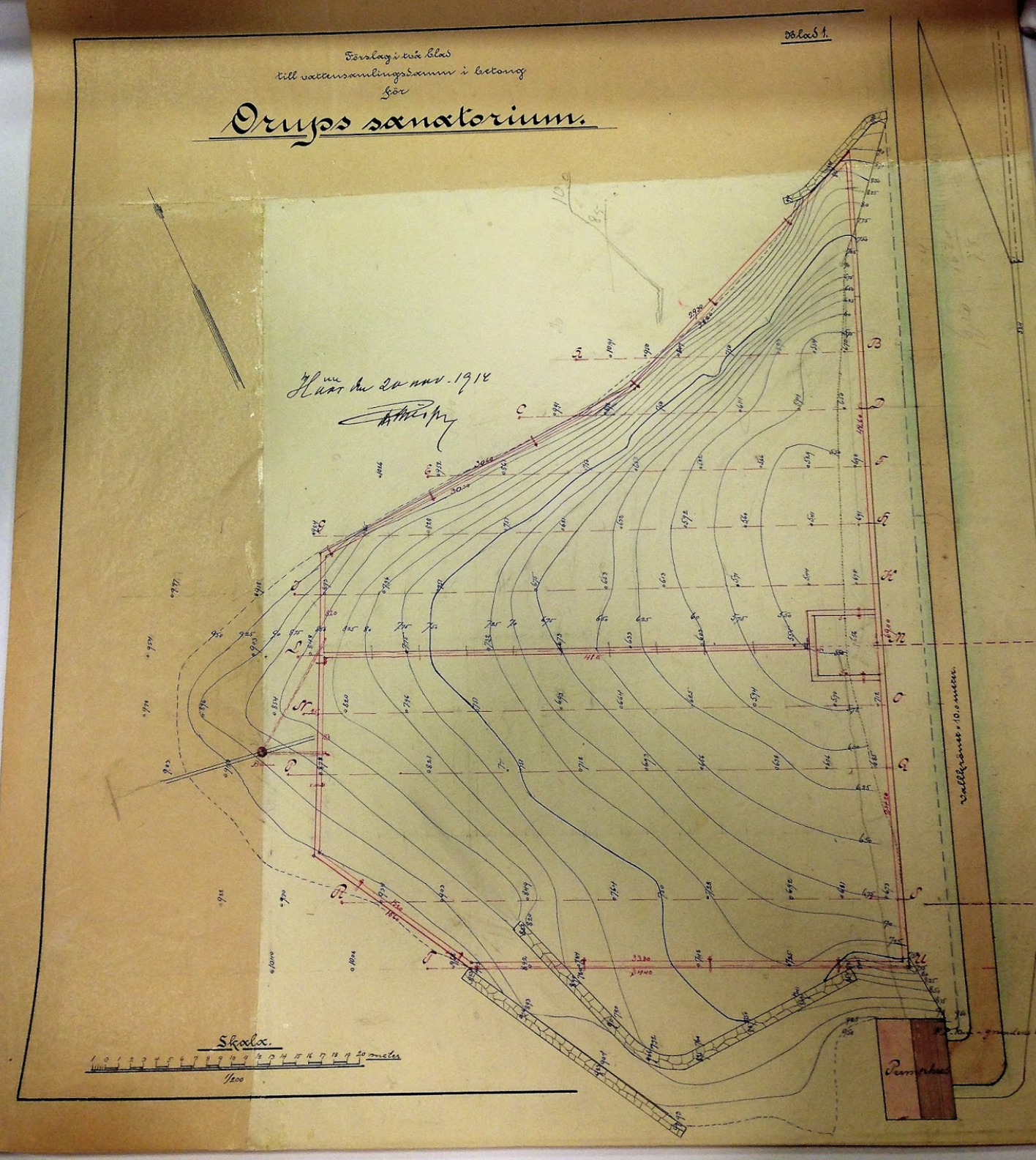 Vattenförsörjningen vid Orup var återkommande en svårlöst fråga. Förslags togs fram gällande att anlägga en vattensamlingsdamm inne i skogen, i närheten av det området som idag kallas Karlslund. Kartan nedan är från 1914 och visar "förslag till vattensamlingsdamm i betong för Orups sanatorium".
