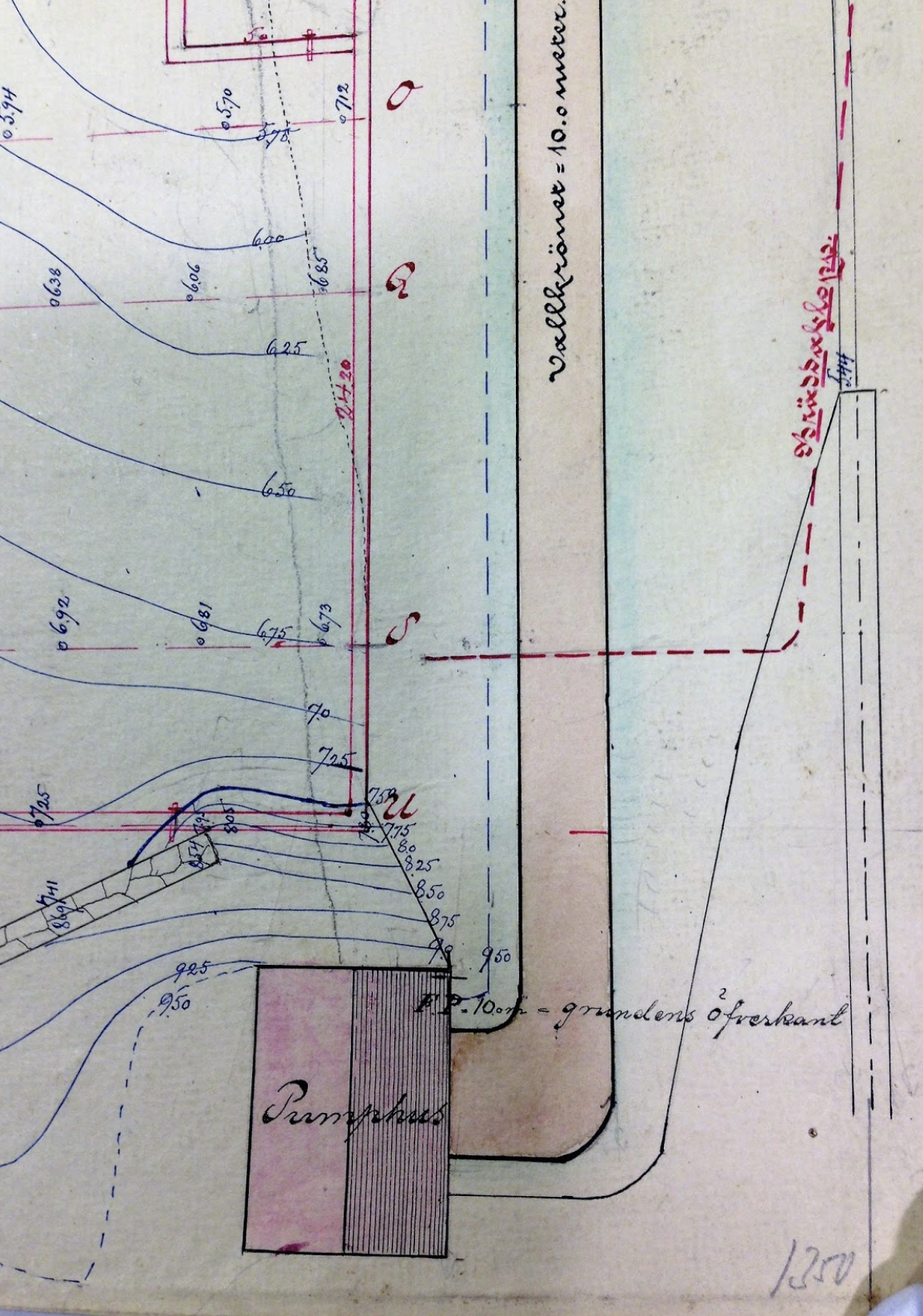 En planritning på pumphus från 1922. Med följande text på baksidan: Nya pumphuset vid gränsen till Skogsgård. Grundvattentäkten.